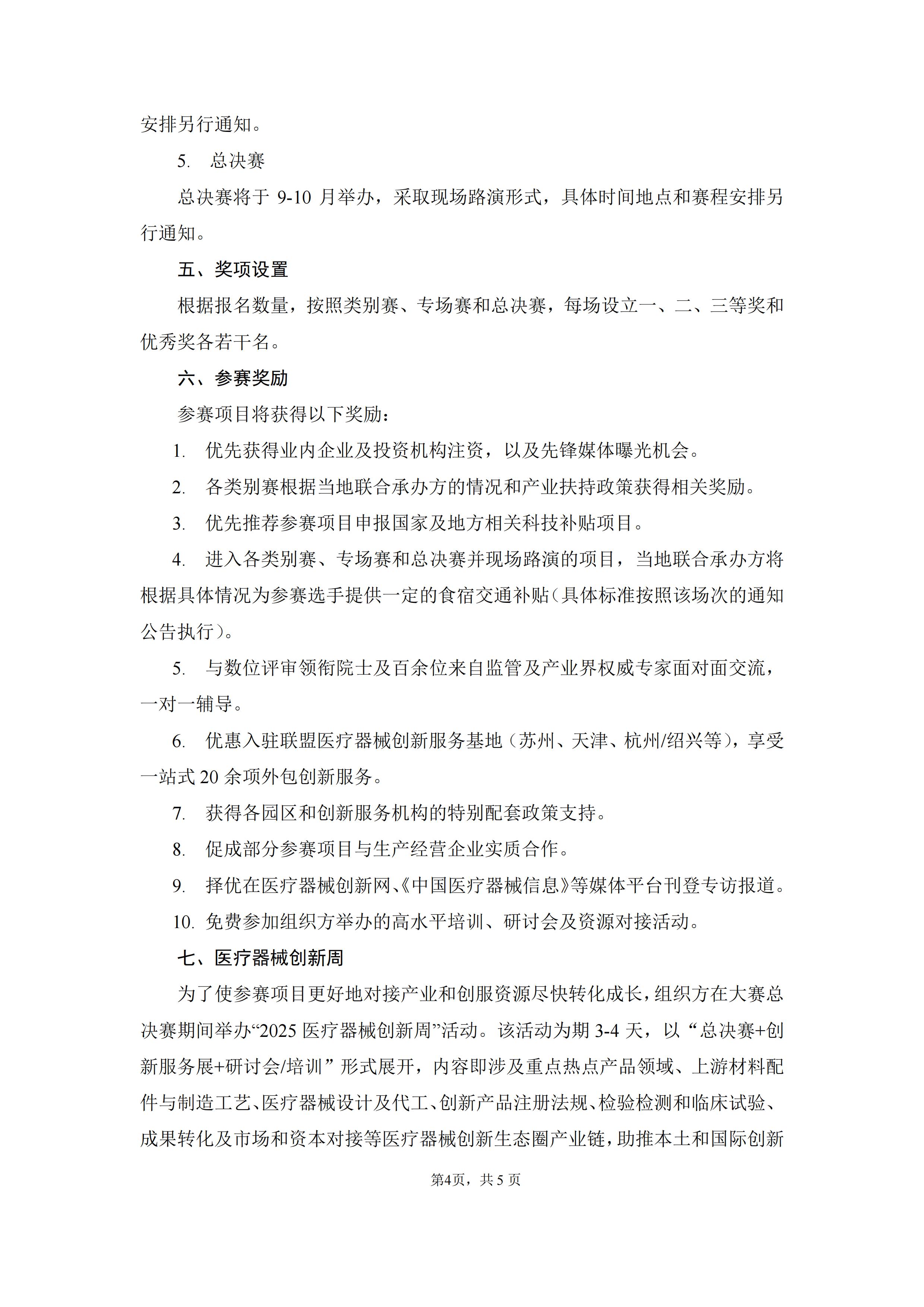 为了使参赛项目更好地对接产业和创服资源并实现尽快转化成长,将在大赛总决赛期间举办“2025医疗器械创新网周”活动,该活动为期3-4天,以“总决赛+创新展+研讨会/培训形式展开,内容即涉及重点热点产品领域、上游材料配件与制造工艺、医疗器械设计及代工、创新产品注册法规、检验检测和临床实验、医学成果转化及市场和资本对接等医疗器械创新网生态圈、产业链,助推本土和国际创新协作,加快医疗器械临床科研及院所成果转化,促进全球和中国医疗器械产业持续创新发展。